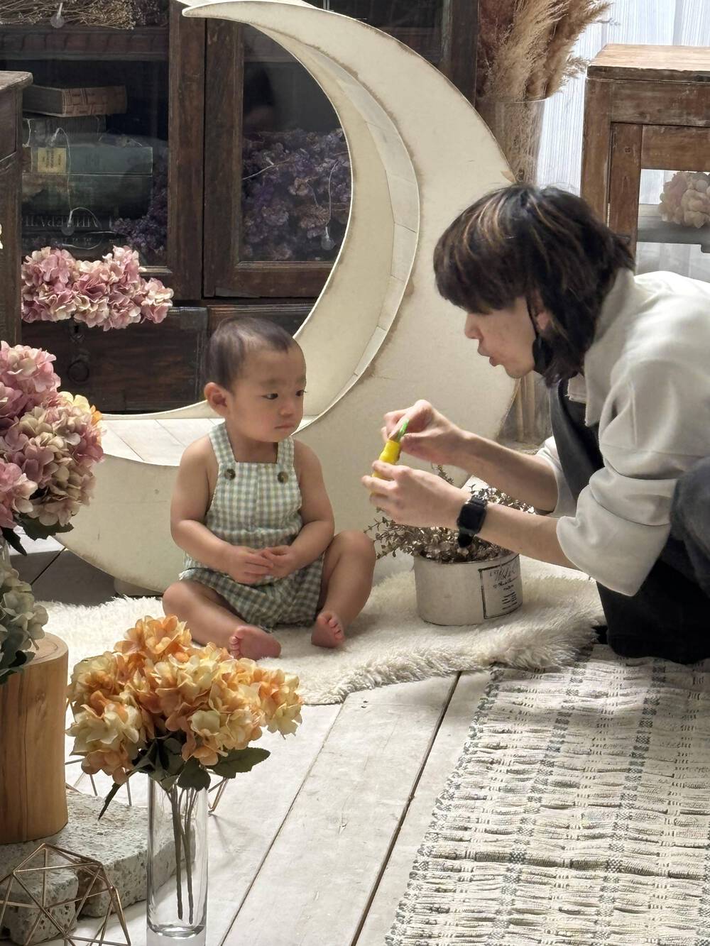 1歳の記念に写真を撮っていただきました!スタジオに入ったときから子供も親もリラックスできるよう話をしてくださったり遊んでくださったり。写真を撮っている間はもちろん、それ以外でも明るく声をかけてくださったので、終始楽しみながら最後まで泣かずに撮影することができました!また平日伺ったこともあり、撮影後データを待っている時間も広いところで遊ばせていただき、至れり尽くせりでした><