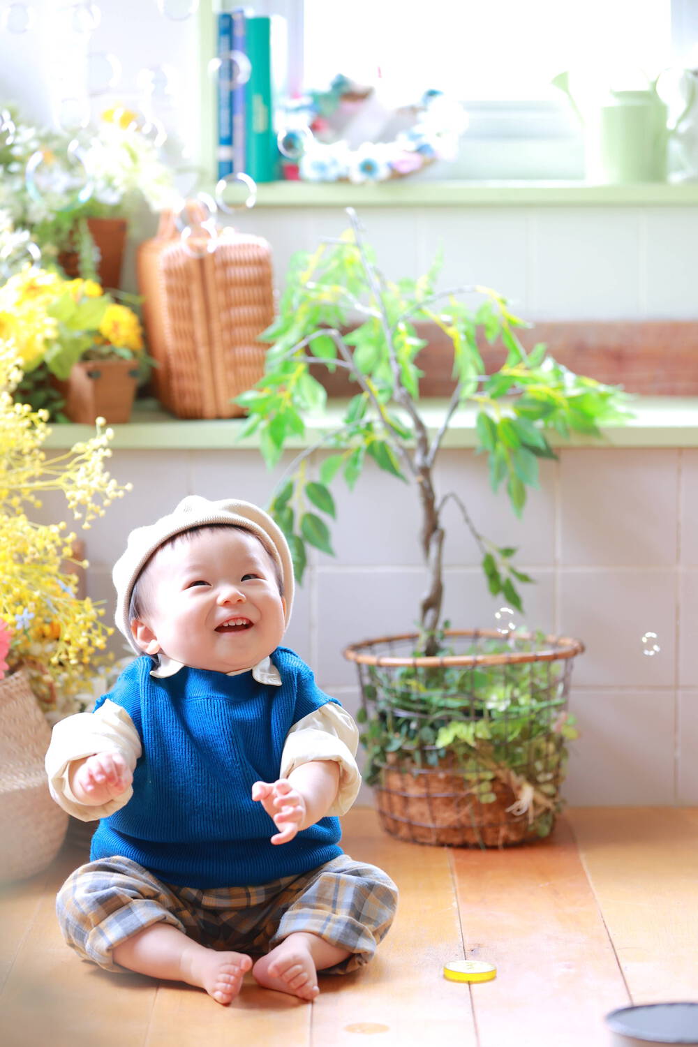 初めてのスタジオ撮影。泣きグズり虫の1歳児を連れ、どうなるかな、ずっと泣いたりしないかな、と不安を抱え挑んだ撮影当日。待合室で担当スタッフさんと戯れてもらったところからその不安は和らぎ、いざ撮影が始まると吹き飛びました。とにかくあの手この手であやしてくれて、自然な笑顔や表情をどんどん引き出してくれました。子の笑顔がたくさん見えると、親の私たちも嬉しくて、テンションが上がってしまい、2時間ほどの撮影があっという間に感じたほどでした。