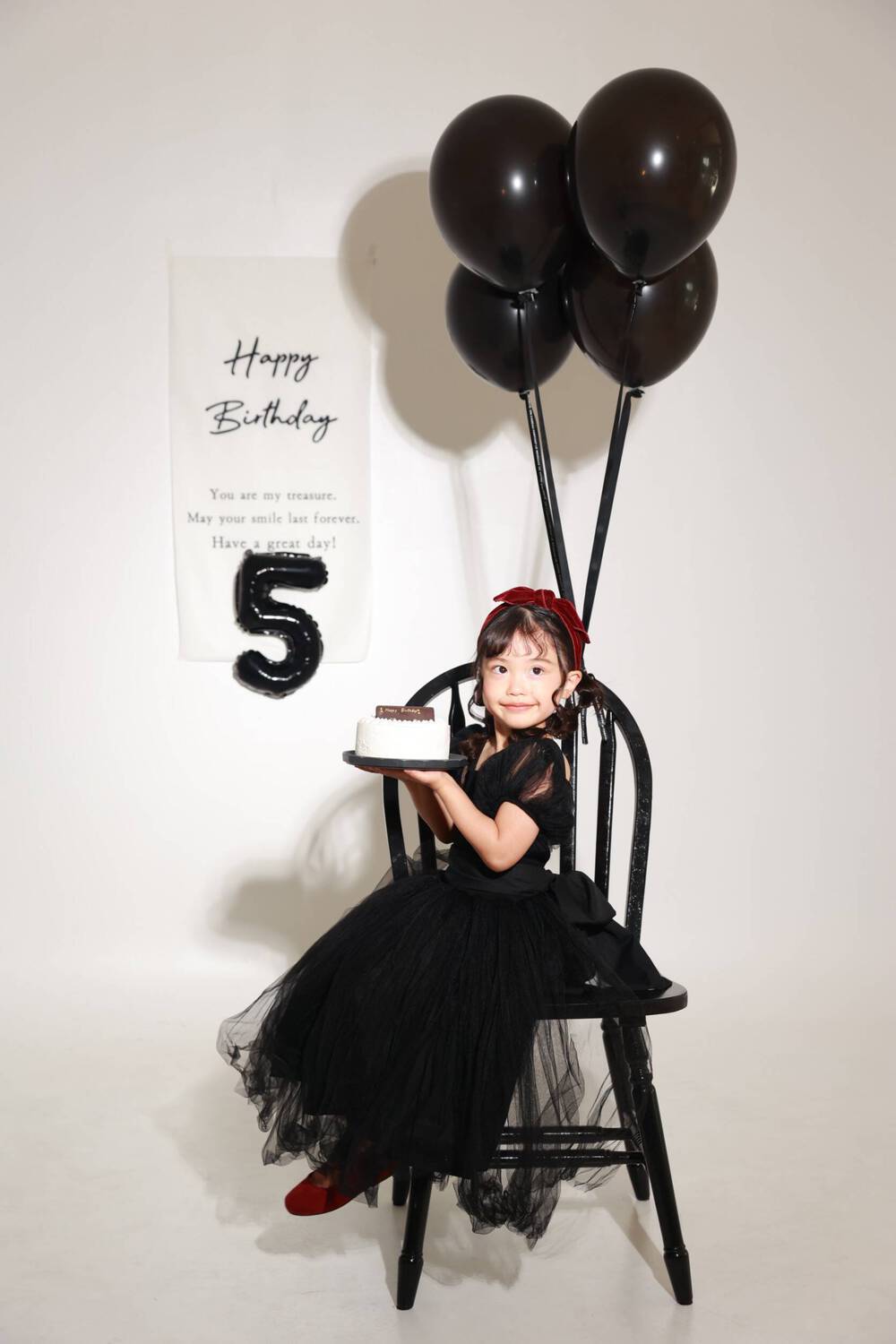 5歳の娘の誕生日に、アニバーサリーケーキフォトを撮影していただきました^ ^BLACKな背景と衣装で大人っぽさもありつつ、赤のヘアバンドと赤の靴というコーディネートで可愛さもあり、素敵に撮っていただけて大満足です。