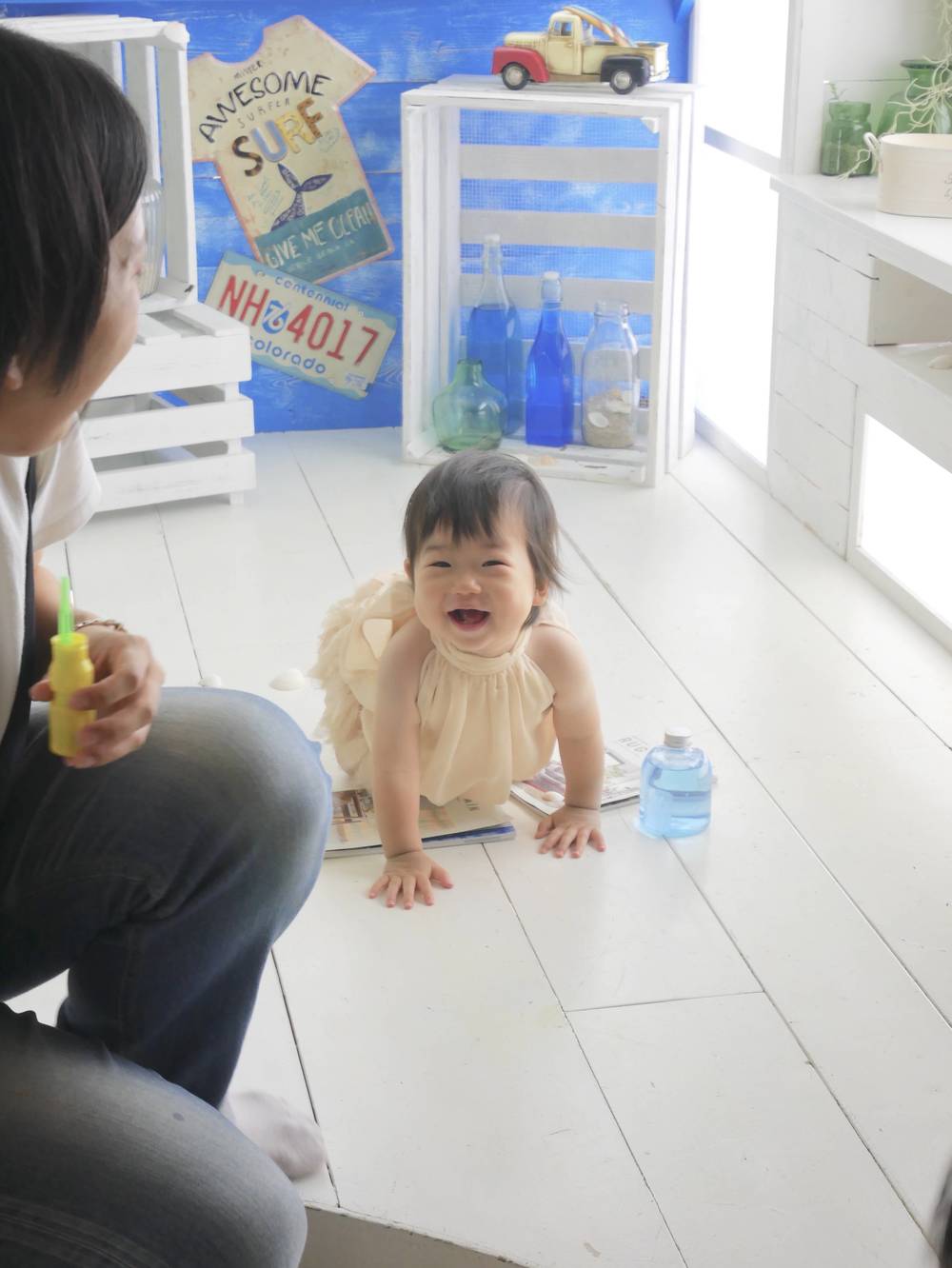 娘の1歳記念に、撮影していただきました!初対面の人には泣く&怯える&笑顔がひきつる娘なので、笑顔で撮影できるかとても心配...