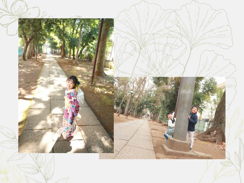 スタジオから徒歩3分の【八雲氷川神社】での撮影は、アクセスの良さはもちろん、木漏れ日と四季の彩りが魅力。