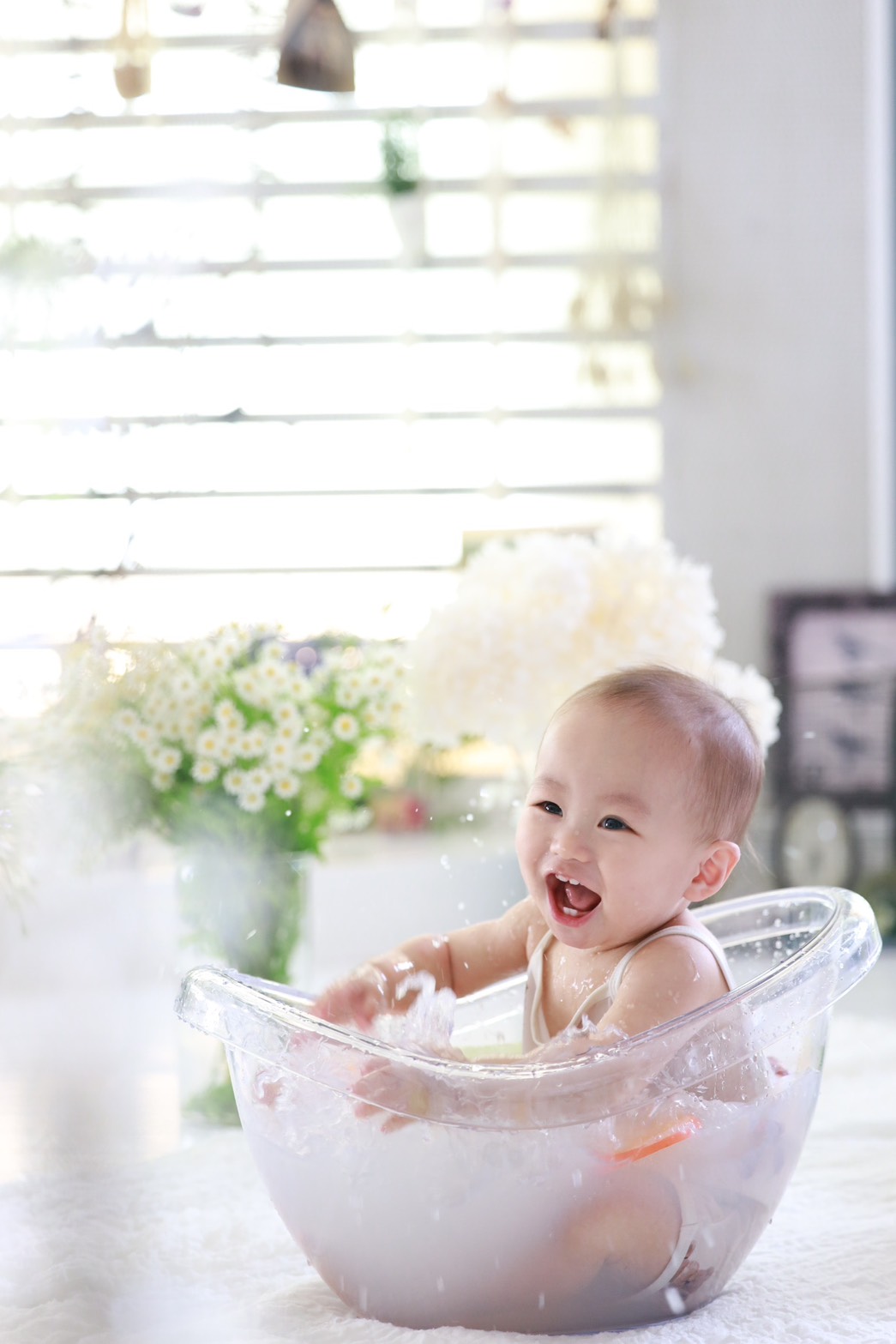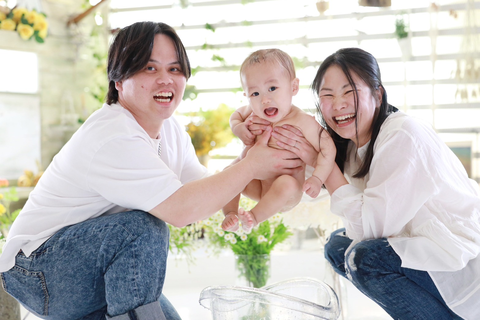 お子さまと旦那さまとご来店いただき、今回は家族写真やミルクバスの撮影を行いました。