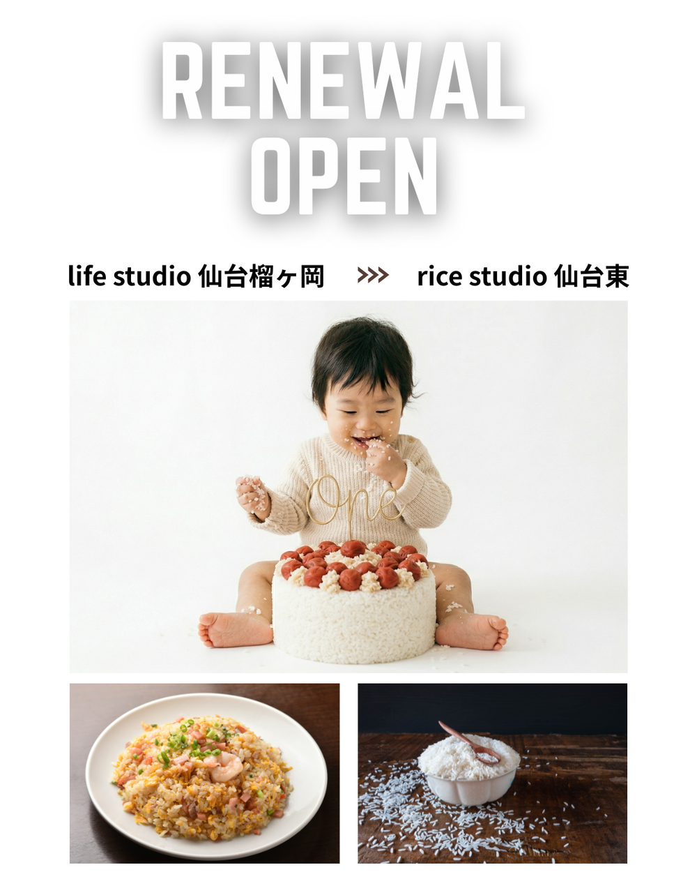 本日より、ライフスタジオ仙台榴ヶ岡店は、世界初のお米専門写真館『ライススタジオ仙台東店』としてリニューアルオープンいたします。