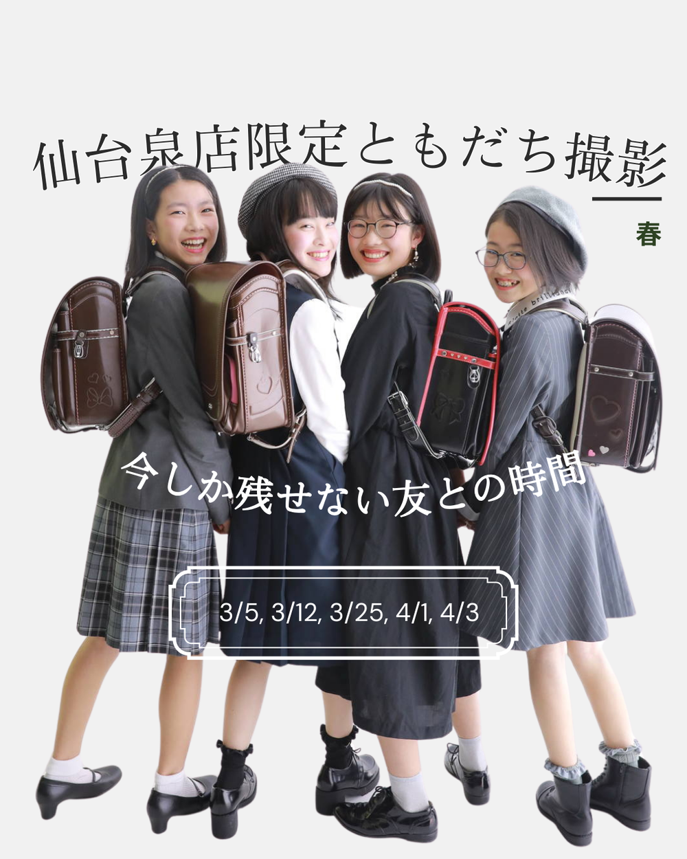 草加店 【卒業・入学記念イベント】ことメモ。卒業 2026/2/27 0 あっという間に過ぎていく毎日の中で、 仙台泉店 お友達撮影イベント 2026/2/26 0 仙台泉店限定|お友達撮影イベント 仲良しのお友達と一緒に、春の思い出を写真に残し 水戸店 【水戸店】2つの選べるロケーション撮影 2026/2/19 0 今年は選べるロケーション撮影が始まります♪ 仙台泉店 [満員御礼]はいはいレース 2026/2/18 0 満員に達したため受付を終了しました イベント一覧に戻る