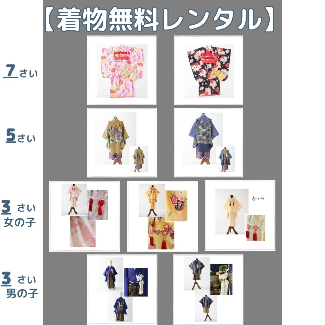 レンタルのお着物、草履、バッグ、足袋、腰紐類 は一式無料レンタルとなりますが