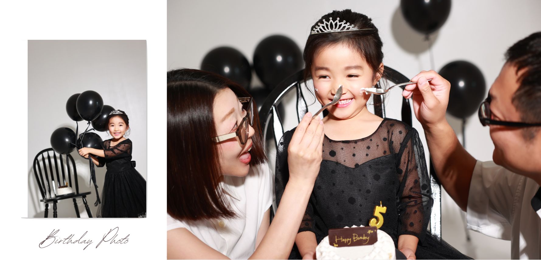 衣装や小物に統一感を持たせて撮影できる、「かっこいい黒」のインテリアを準備してお待ちしております。お子様1人でも、おじい様おばあ様だけでも、家族みんなでも、どんなメンバー構成でも撮影可能な空間です。ケーキを使い、お祝いしている写真を撮影していただけます。
