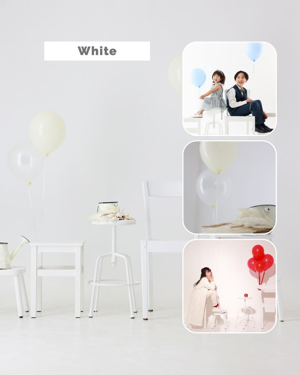 衣装や小物に統一感を持たせて撮影できる、4色のインテリアを準備してお待ちしております。お子様1人でも、おじい様おばあ様だけでも、家族みんなでも、どんなメンバー構成でも撮影可能な空間です。ケーキを使いお祝いしている写真を撮影していただけます。