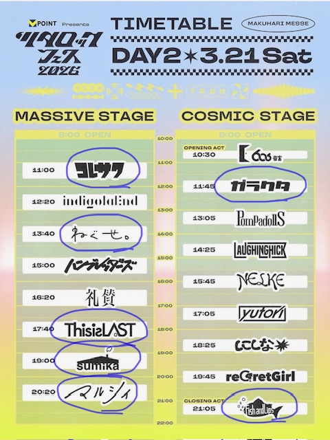 目当てのアーティストは、「マルシィ」「コレサワ」「ねぐせ。」「this is Last」です。