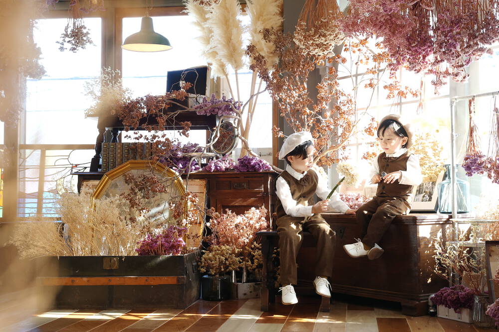 まるで絵本に出てくるようなアンティークな空間の中に、かわいい男の子2人がちょこんと座っています。