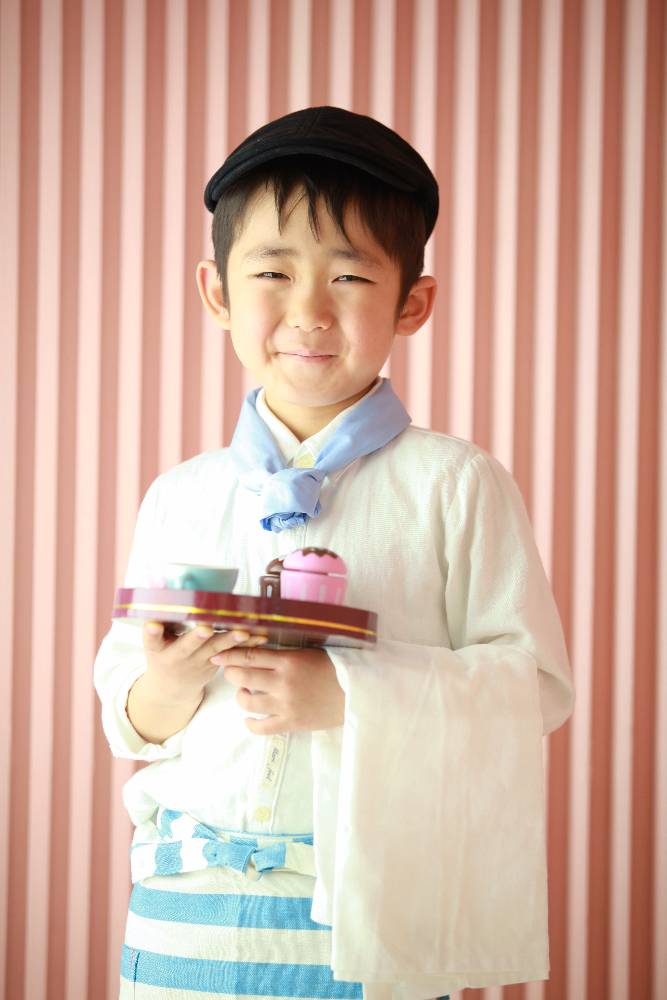 少し大きめのコックコートに袖を通し、立派な小高いコック帽をかぶり、一丁前な表情。