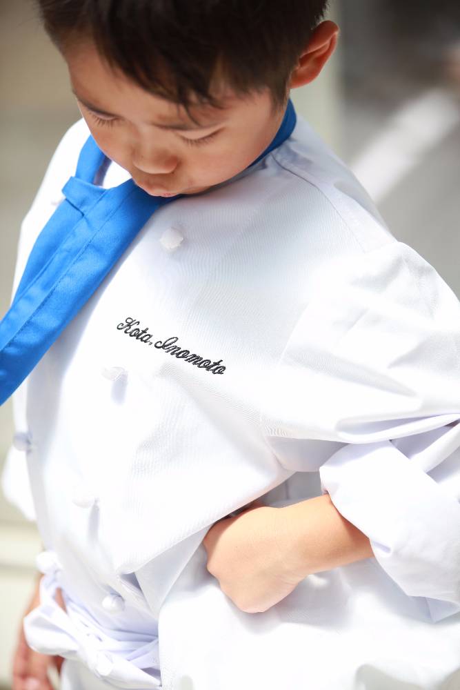 まだまだ大きいそのコックコートがピッタリになるのを楽しみにしてます。