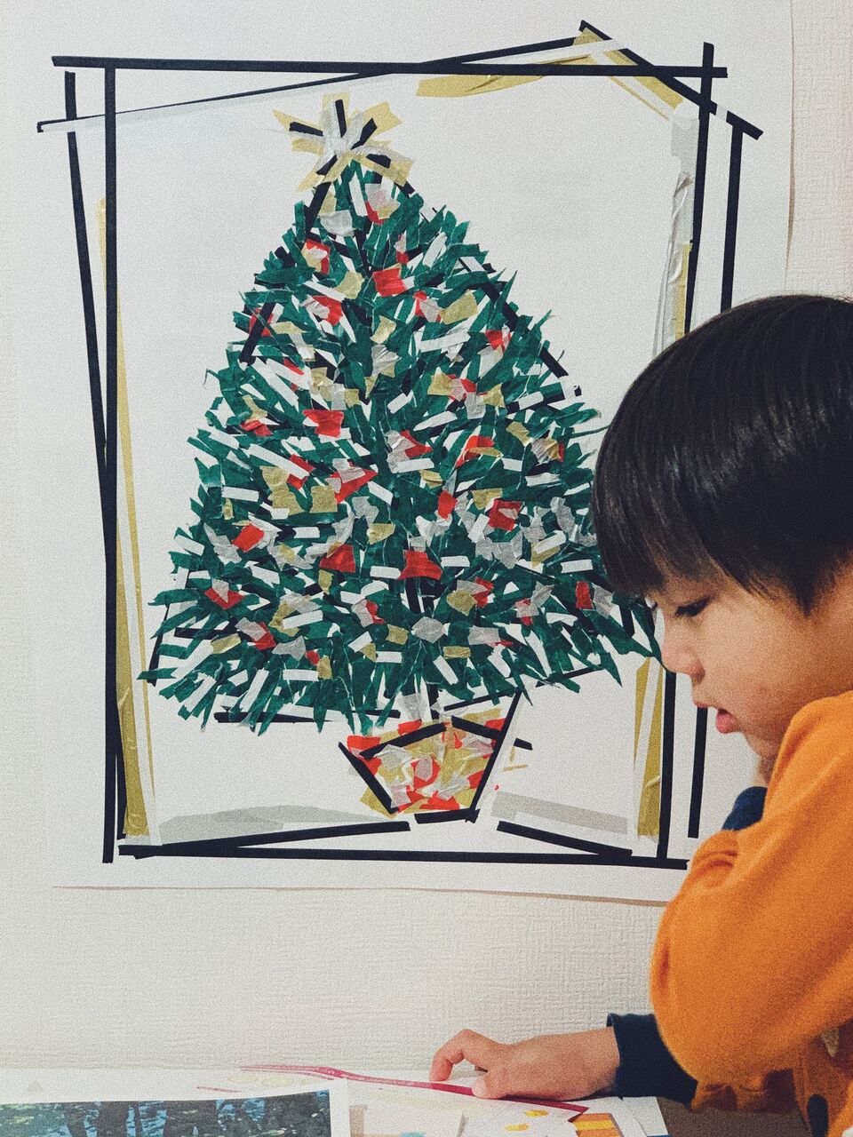 その裏紙にクリスマスツリーを作成。ツリーを買おうか迷ったけど、うちは何でも作ってみる。ヘンテコかもしれないけど作って感じる何かを楽しむ。