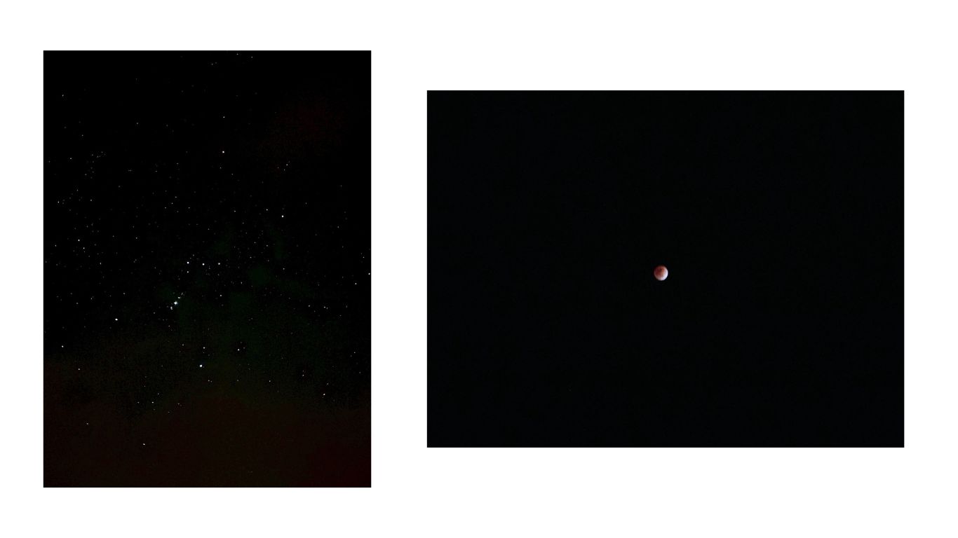 望遠鏡に向かい、空を見ているとそこには 雲のない満点の星空 と 赤く欠け始めた月 がありました。