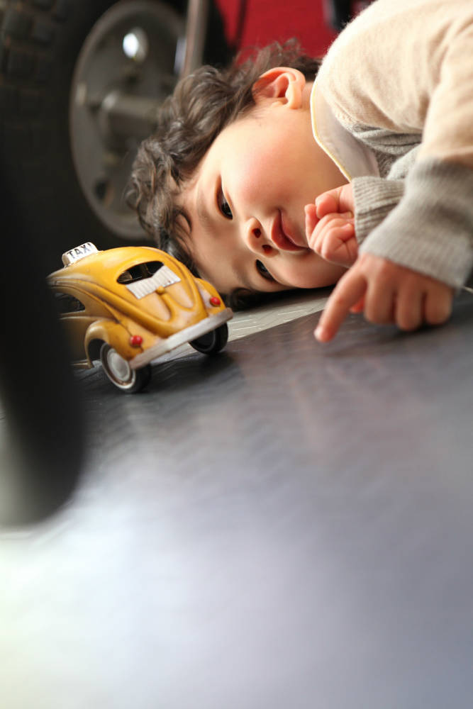 彼は車のブリキのおもちゃを床に頭をつけてじーっとのぞいて時々指で動かすのがお好き^^