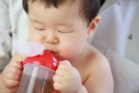 撮影の合間に一息。パパのおひざでお茶をグイッと「ふぅ…モデルも大変だぜぃ」