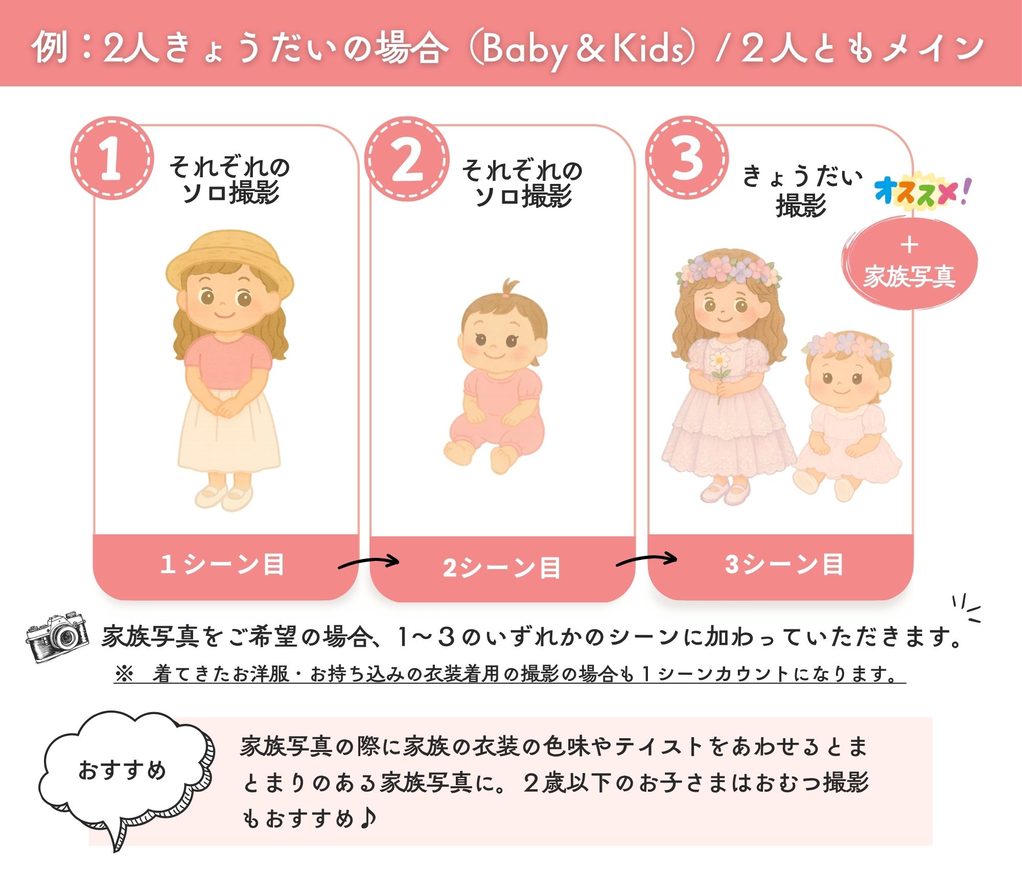 ②家族撮影ときょうだい撮影は1シーンのみとなります。