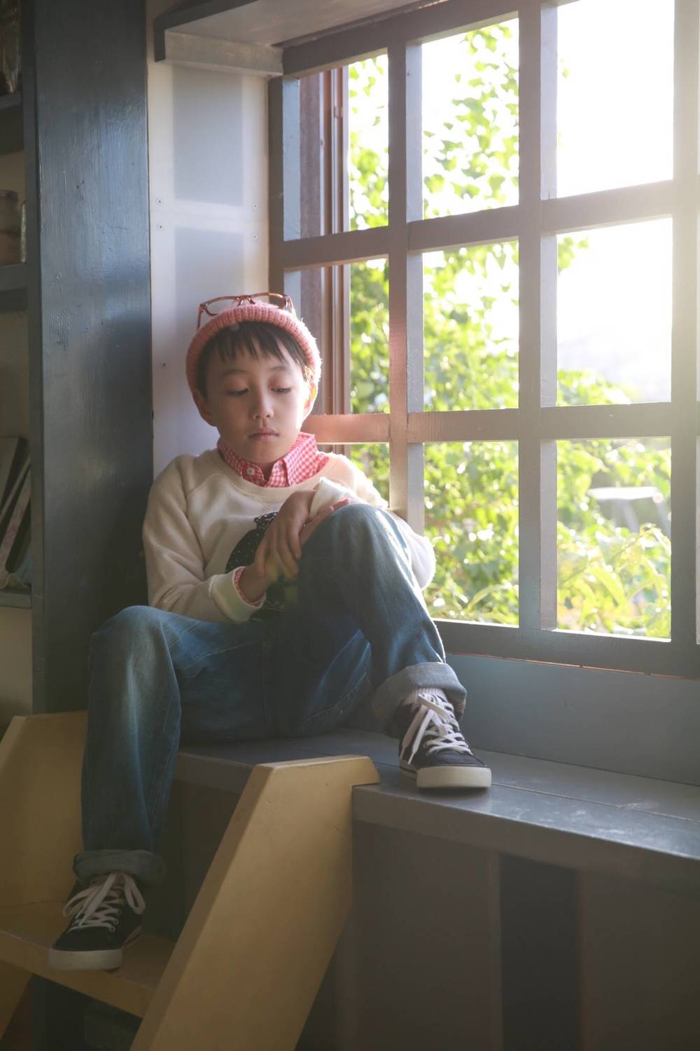 この1つ前写真では同じ窓辺を正面から、明るく、こどもらしいポージングと表情をふんわりとした印象で残していたため、