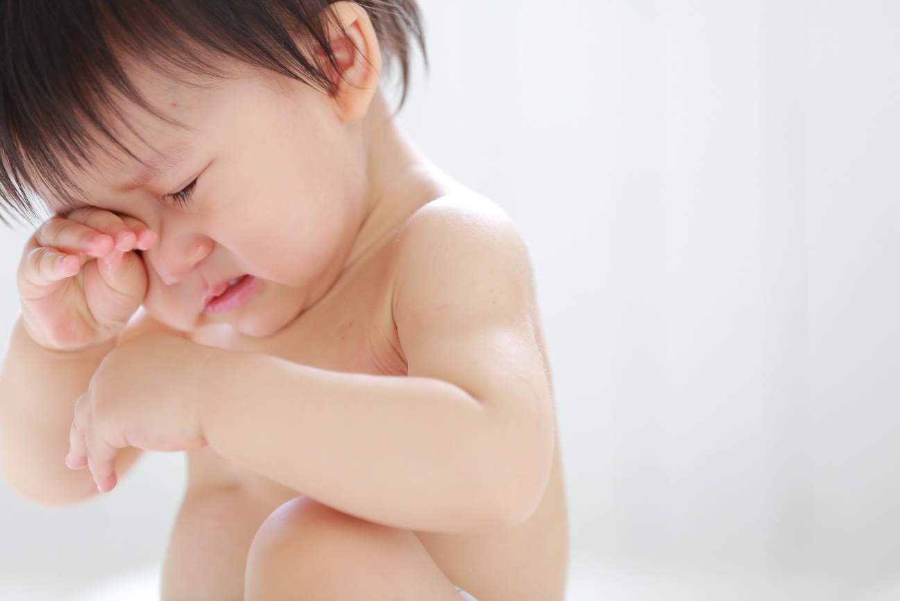 お洋服やドレスを着て、緊張から泣いてしまったいた赤ちゃんが、