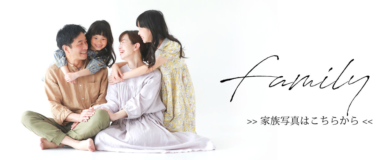 ライフスタジオでは追加料金などは一切かからず、3つの撮影構成のどこかで一緒に家族写真もお撮りします。フォトスタジオで「自然な写真」というワードを作ったライフスタジオならではの遊びながら自由に撮影するスタイルや、ポージングを決めた家族写真など、ご来店下さる皆様に合わせて家族写真を撮影していきます。家族写真を通して家族愛を記録として残していきましょう^^