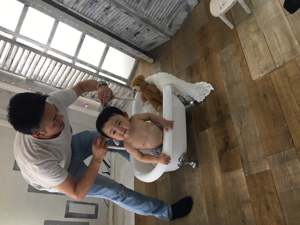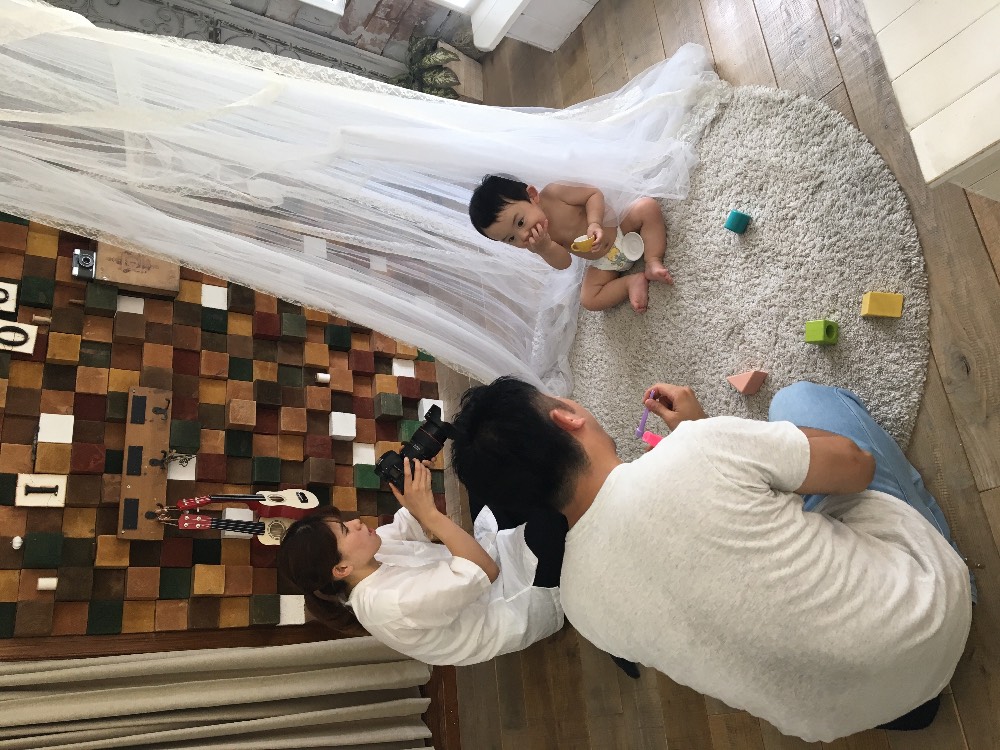 スタジオに向かう車中で一歳の息子が寝てしまい、寝起きからの撮影スタートという、まさかの事態に陥りましたが、お二人のプロの腕で息子は始終笑顔で撮影して頂くことができ、安心致しました〜。