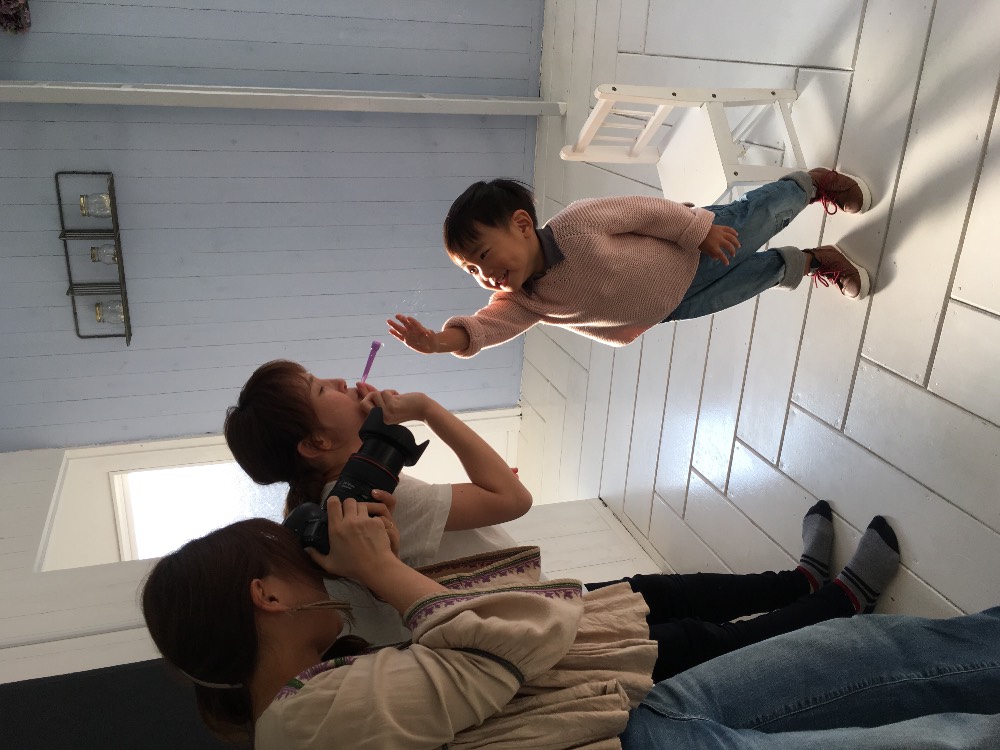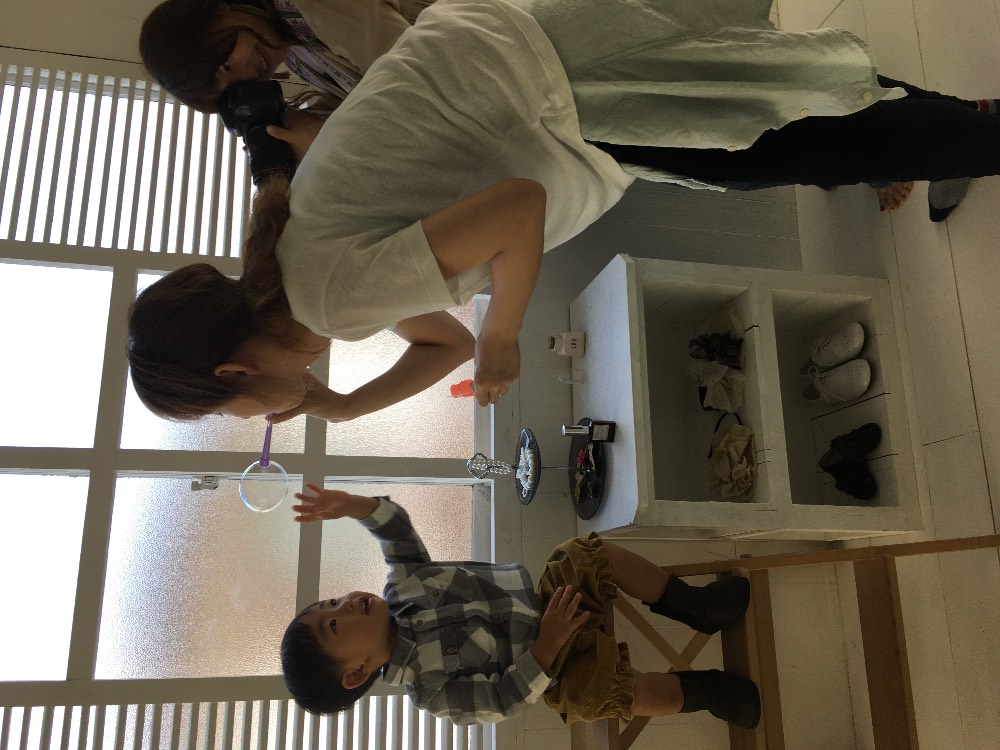 かおちゃん&さきちゃんへ2歳の記念撮影、ありがとうございました!昼寝後で、エンジンがかかるのが遅くてごめんなさい。1年前と違って、自分の意思をはっきり示せるようになった息子に、成長を感じることができました。1年前はこわがって泣いてしまったシャボン玉も、2歳の息子は喜んでニコニコ笑顔でした。なかなか心の扉を開かない息子に、たくさんの笑顔や声かけ、ありがとうございました。お二人が一階に行っている時に、『ない、ない』と言って階段のところまでお二人を探しに行って、『おねーさーん』と呼んでいたのがかわいかったです。短い時間で子どもの心をつかむお二人、さすがだなと思いました。最後のどーっちだは、家でやっても大盛り上がりでした(*^^*)あと、このイベントのおかげで、カメラマン気分を味わえて楽しかったです!一瞬一瞬をとらえるのって難しいですね(>_<)