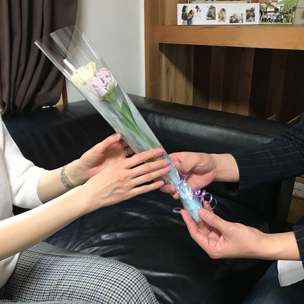 写真はホワイトデーキャンペーンで頂いたお花を妻へプレゼントしたところです。