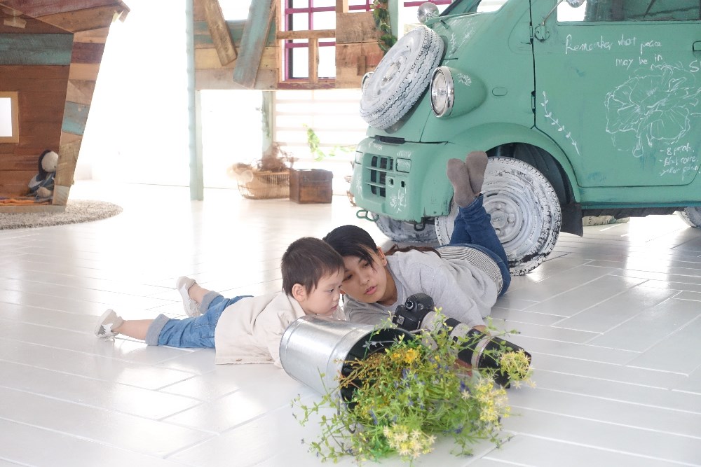 なっちゃんのシャボン玉に夢中なふたりとくろちゃんの写真をチェックしている息子の写真です(笑