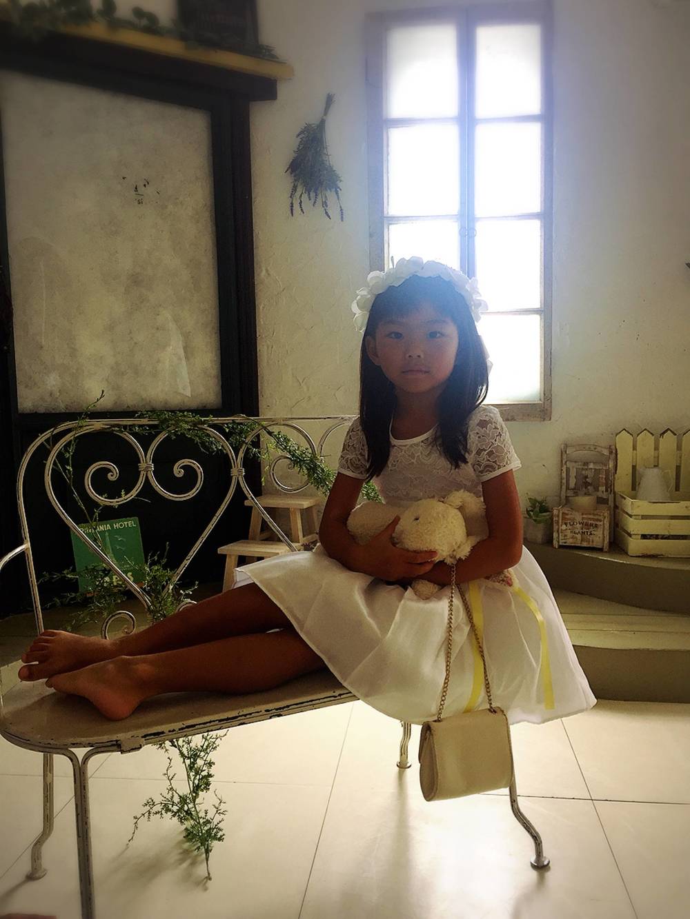 毎年お誕生日の記念にライフスタジオで撮影してもらっています。娘もこの日を楽しみにしていました。今年はついに自分で小物を提案したり位置を決めたり、セルフプロデュースが始まってしまいました(笑)これはどうしてもやりたいと言い張った、ドレスで椅子に座ってうさぎちゃんを抱っこするポーズです。