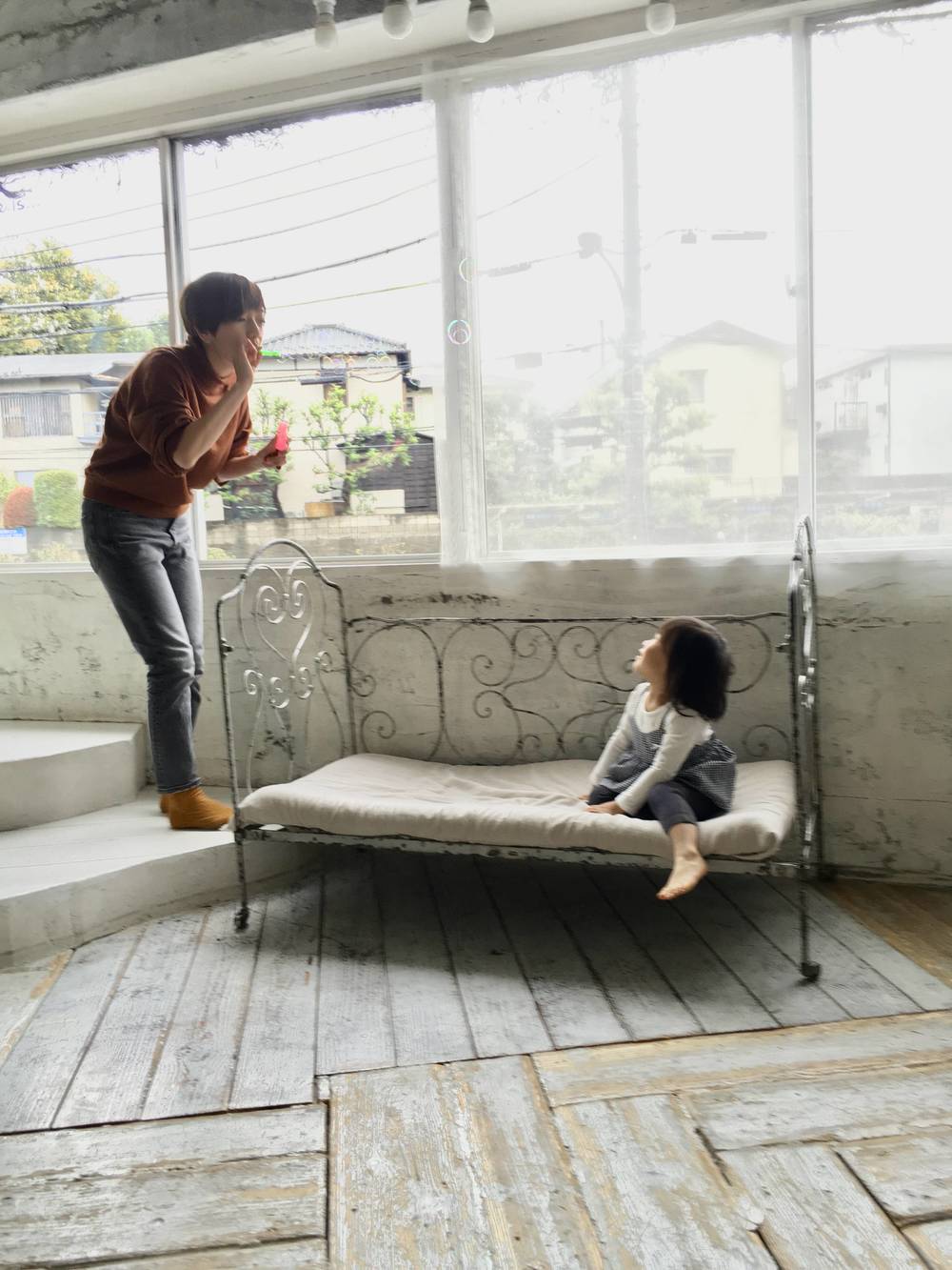 担当してくださった、三井さんと丹生さんは、絶妙な声かけで娘とだんだん距離を近づけていってくださいました。撮影を始めてすぐ、娘の大きな笑い声がスタジオに響き、親である私たちもテンションアップ!特に、シャボン玉や動物の声マネなどがツボにハマったようです!