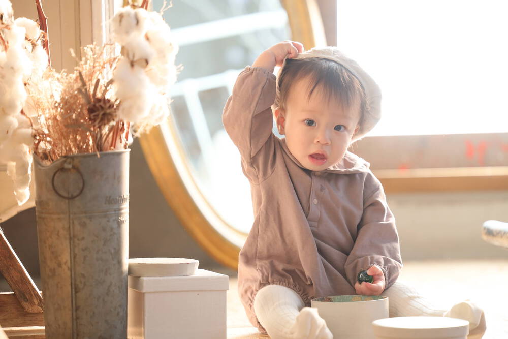 笑顔、泣き顔、指を咥える姿、階段を登る姿につま先立ちのつかまり立ち…