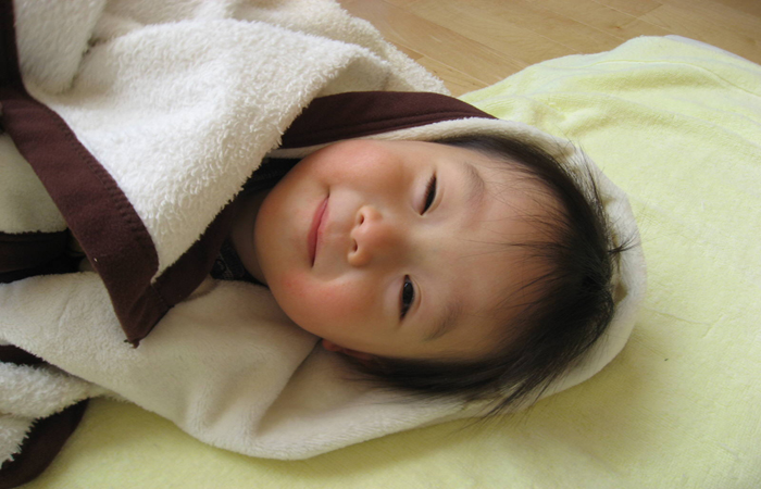 お気に入りの毛布にくるまれてこのうえない幸福。1歳のときの写真ですが、2歳の今でも眠くなるとマイ毛布をひきずってきます。