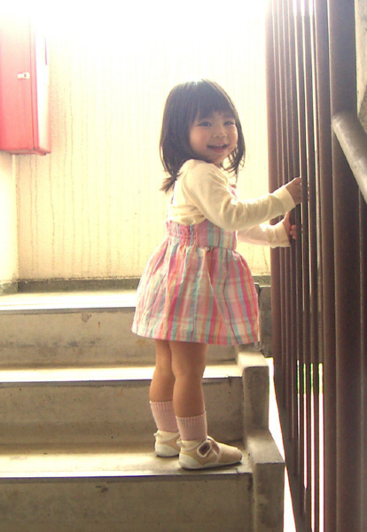 現在は3歳になる娘が、まだ2歳になる前の写真ですが…。娘がそこに立っているだけで、我が家のボロアパートの階段が、