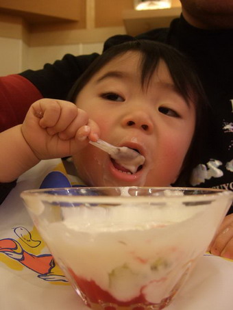とりあえず夢中でヨーグルト食べてます!!夢中になりすぎて、いつもよりもお顔が部ちゃいくになっていますが、そこはご愛嬌ということで(笑)
