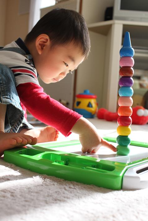 積み上げたベビークレヨンを倒れないようにそ~っとやさしく押してるところです。