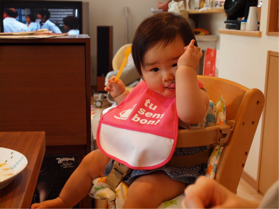 ケーキつながりでベビー用のケーキを両手のスプーンで頬張るうちの姫をアップします