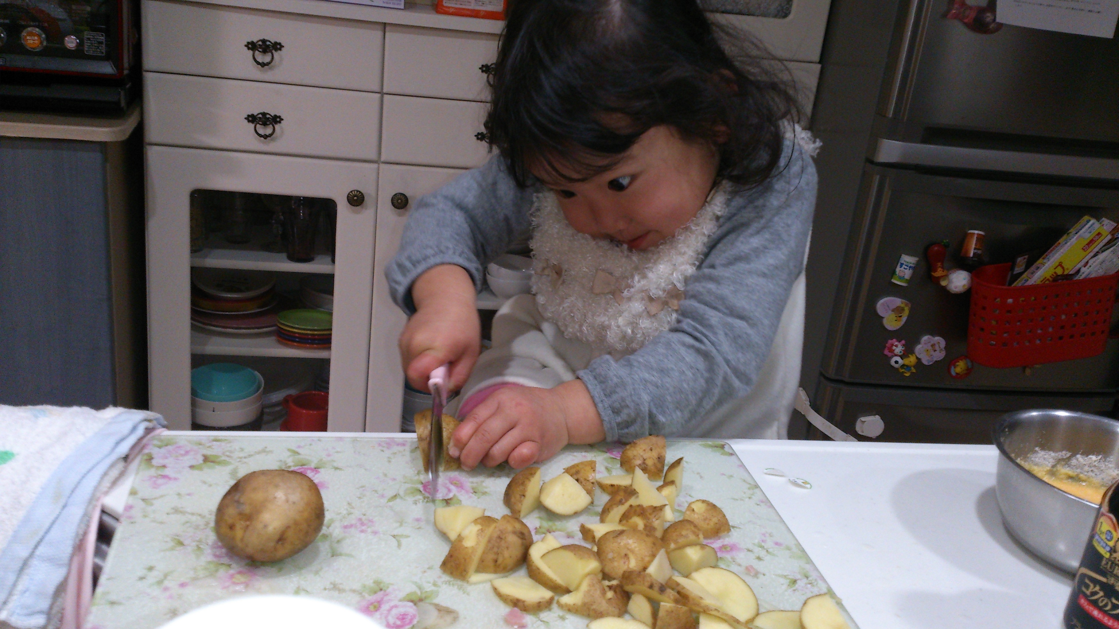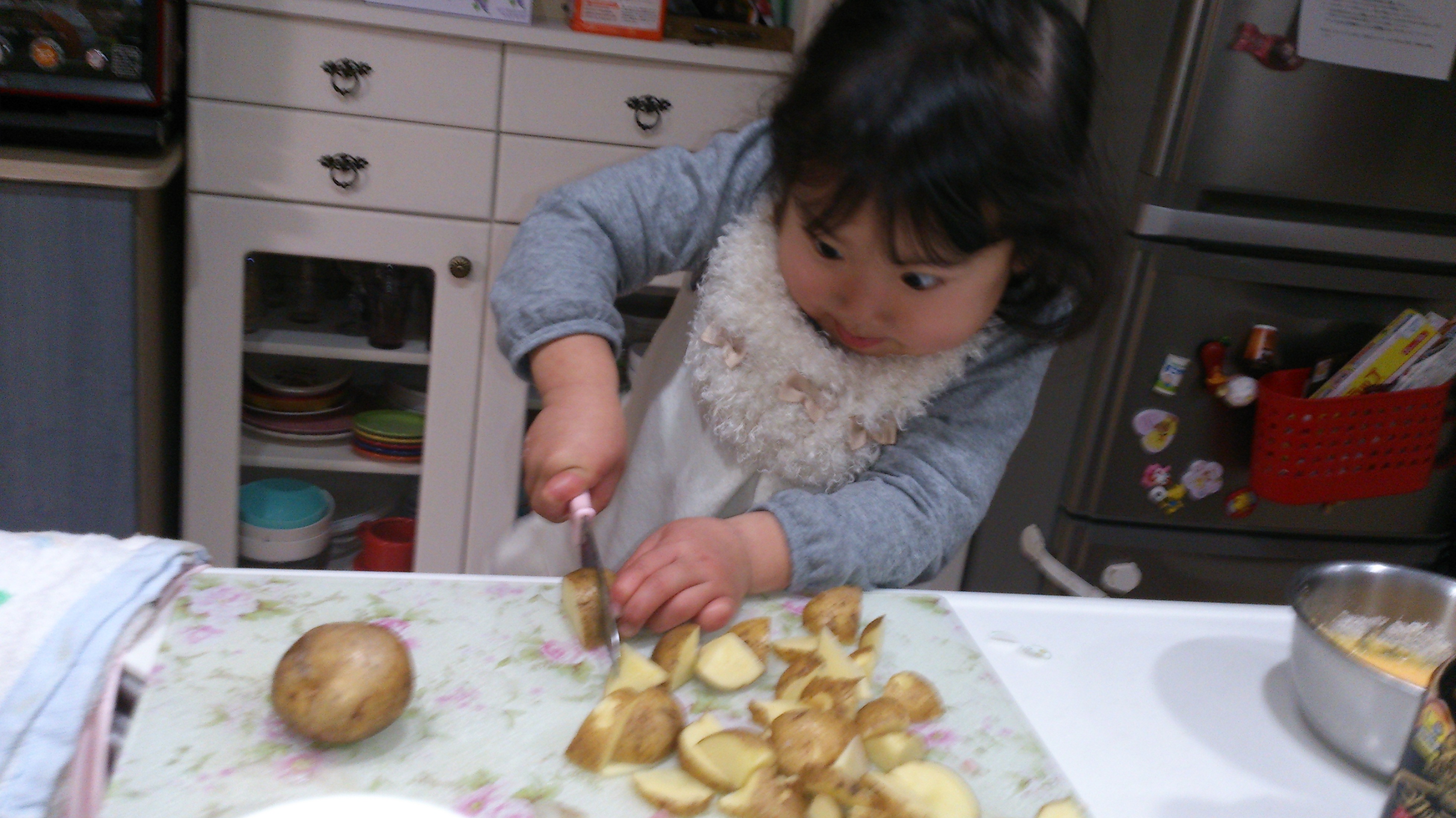 本日、ライフスタジオ草加店でお世話になりました平良です!とても楽しい時間を過ごすことが出来ました。昨年、別の場所で七五三の着物を嫌がり、1人で写すことが出来なかった娘の七五三写真のリベンジでした。緊張しながらも、少しずつ慣れて、バッチリ1人で着物撮影出来ました。祖母に贈られた被布を着れましたし、とても素敵な仕上がりでした。兄も撮影して頂きました。妹の撮影のときは、終始ふざけていましたが、いざ自分の撮影となるとカメラマンさんとの息もぴったりで、私達が入る隙もないほど集中していました。普段見ない一面を垣間見ることが出来ました。いつもはケンカばかりの兄妹ですが、出来上がった写真はとても仲良く見えるので不思議ですね。撮影の合間に、スタッフの皆様に大好評だった、「じゃがいもを切るムスメ」を添付させていただきます(*^^*)