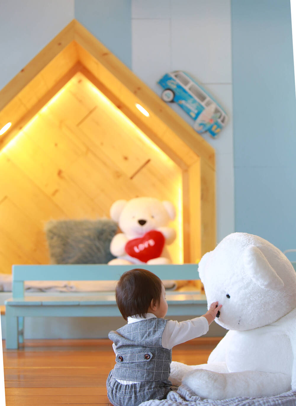 1歳のバースデーフォトでスタジオ撮影デビューしました。初めてだったので、キョロキョロ不安そうにして、抱っこから下ろすと泣...