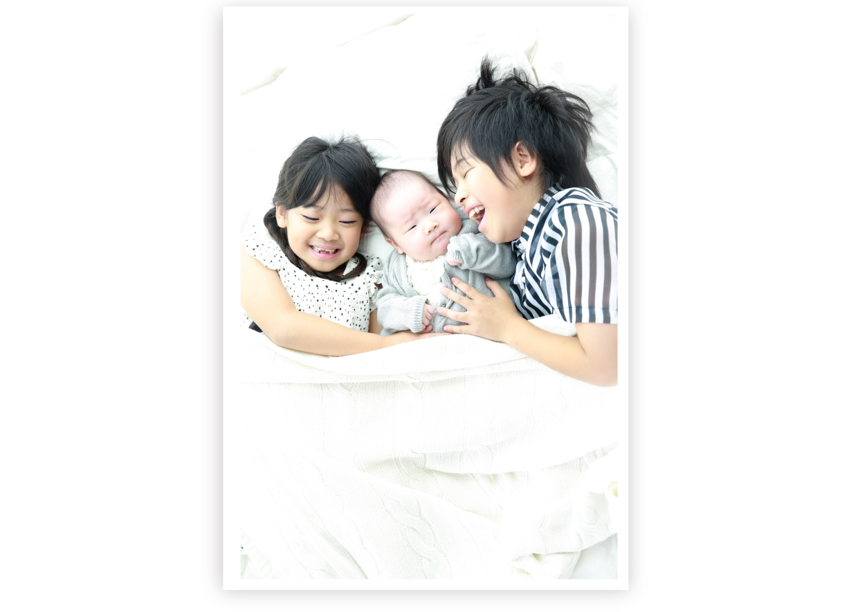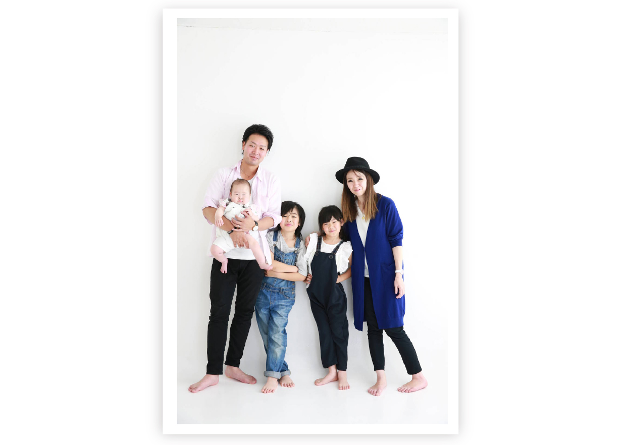 そんなとき、「工藤ちゃん、頼むね。金丸さんの撮影に入ってほしいんだ。」と、加藤さんから声がかかり、二人を引き継ぎ私が担当させていただくことになりました。担当が私に代わっても、変わらず金丸ファミリーはライフスタジオに年に2回、通ってくれました。パパとママは謙虚で丁寧な方で、子どもたちには厳しいところもありますが、でもライフスタジオで子供たちの誕生日には写真を撮ることを本当に楽しみにしてくれます。こどもたちも、早々に私の名前を「さっちゃん」と覚えてくれていて、ある日道端で会った時も私は気が付かなかったのですが、子供たちが遠くから走って「さっちゃーん!」と声をかけて駆け寄ってきてくれました。私は徐々に金丸ファミリーの中にある私の存在が色濃くなっていくことを、本当にうれしく感じていました。最初は加藤さんから託された大切なファミリーでしたが、話しているとママからライフで撮ることの意味や普段は言葉に出すのが照れくさいであろう家族への愛情が伝わってきます。真正面から家族へ伝えることがあまりないママですが、この家族と一緒にいるとそんなことわざわざ必要がないと言えるくらい、ただ一緒に家族でいることが幸せなのが伝わってきます。その幸せな存在と時間を形にして積み重ねていくために、ライフスタジオに来てくれているのだなと思いました。
