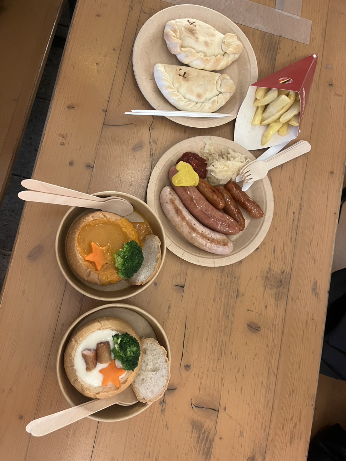 ココアやソーセージ、ドーナッツやチュロスなどたくさんの食べ物が並んでいてみんなで何を食べようかとルンルンでお話しました♪