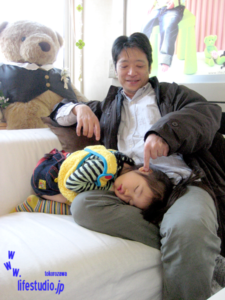 撮影終了後は疲れちゃったみたいで、パパのおひざでぐっすりでした。