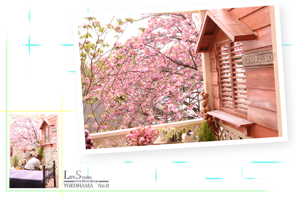 満開の桜の写真にテラスのお手入れをする乙女の後姿を添えてみました!!