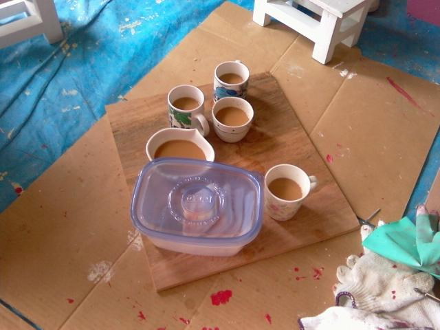 木の板をトレイの代わりにしてダンボールのテーブルです。