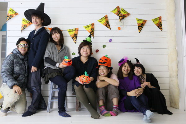 写真左から、風邪をひき室内なのにダウンを着ている仮面舞踏会の洋典リーダーと、ペテン師魔法使い智くん、かわいいパンプキン里佳ちゃん、いつもイベントのお手伝いをしてくださる仲良しのフランケン・コマさん、面白パンプキンおばけ智ちゃんと、エロティック魔術師美佳ちゃん、そして、おそらく一番似合っていると評判のいたずら小悪魔・真理子ちゃん。