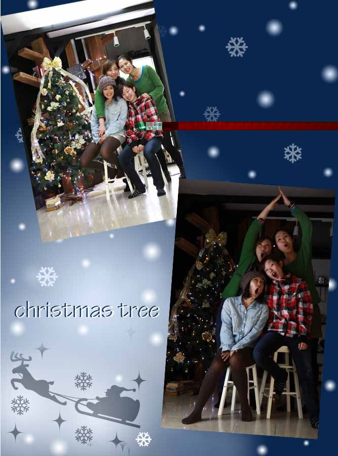 飾った記念にみんなで記念撮影をしましたが、営業終了後の疲れから変なテンションで、ツリー顔の変顔(下)を撮りました(笑)