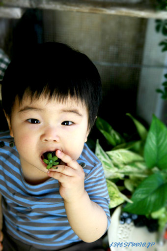 ブラックベリーを片手にポ?ズ★撮影中、しゃぼん玉に夢中でどんどん近づいて来る姿がかわいかったです^^
