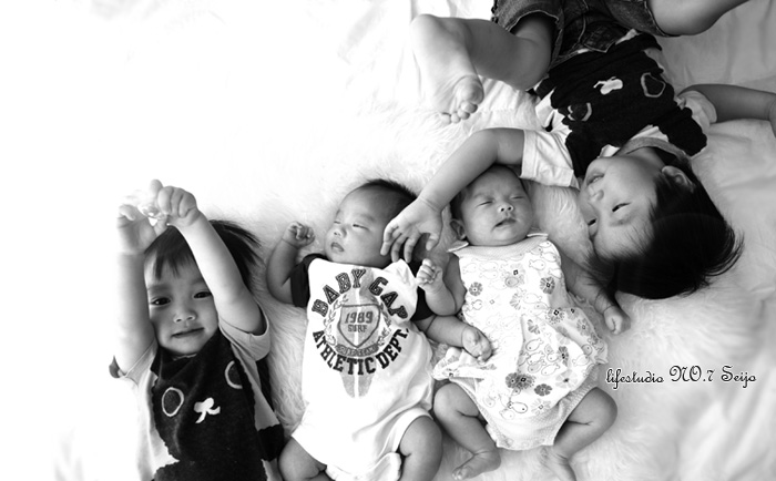お兄ちゃん達に囲まれた男の子と女の子の双子ちゃん☆とっても仲良しの兄弟になるでしょう!この表情を見ればわかりますねぇ♪