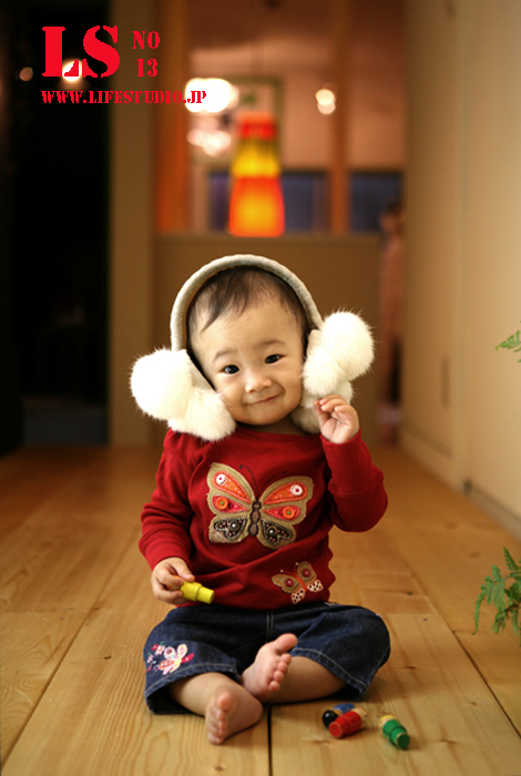 長袖のお洋服とファーの耳あてで秋のファッションを先取り☆この表情と首のかしげ具合がポイントですっ