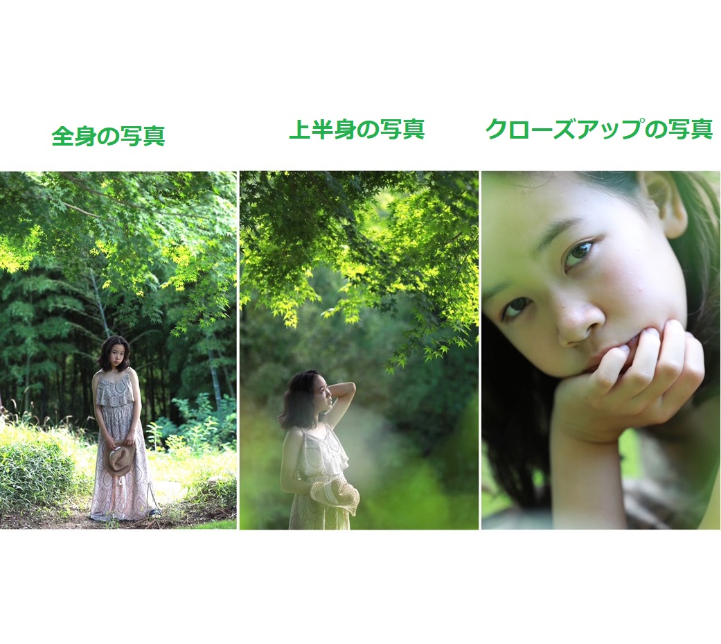 ライフスタジオは75CUTの写真データーをまとめてお客様にお見せしています。その中では2から3回程度お着替えをしたり衣装に合わせて背景を変えたり小物を変えていきます。その中でお子様の様々な美しい角度を探すためにフォトグラファーは自分の持っている撮影技術を全部出しながらシャッターを押していきます。その技術の中でも人物の写真を撮る際の画面サイズに注目してみると大きく分けて3つ種類に分けて撮影されていることが分かります。代表的なのが全身の写真、上半身の写真、クローズアップの写真の3種類です。