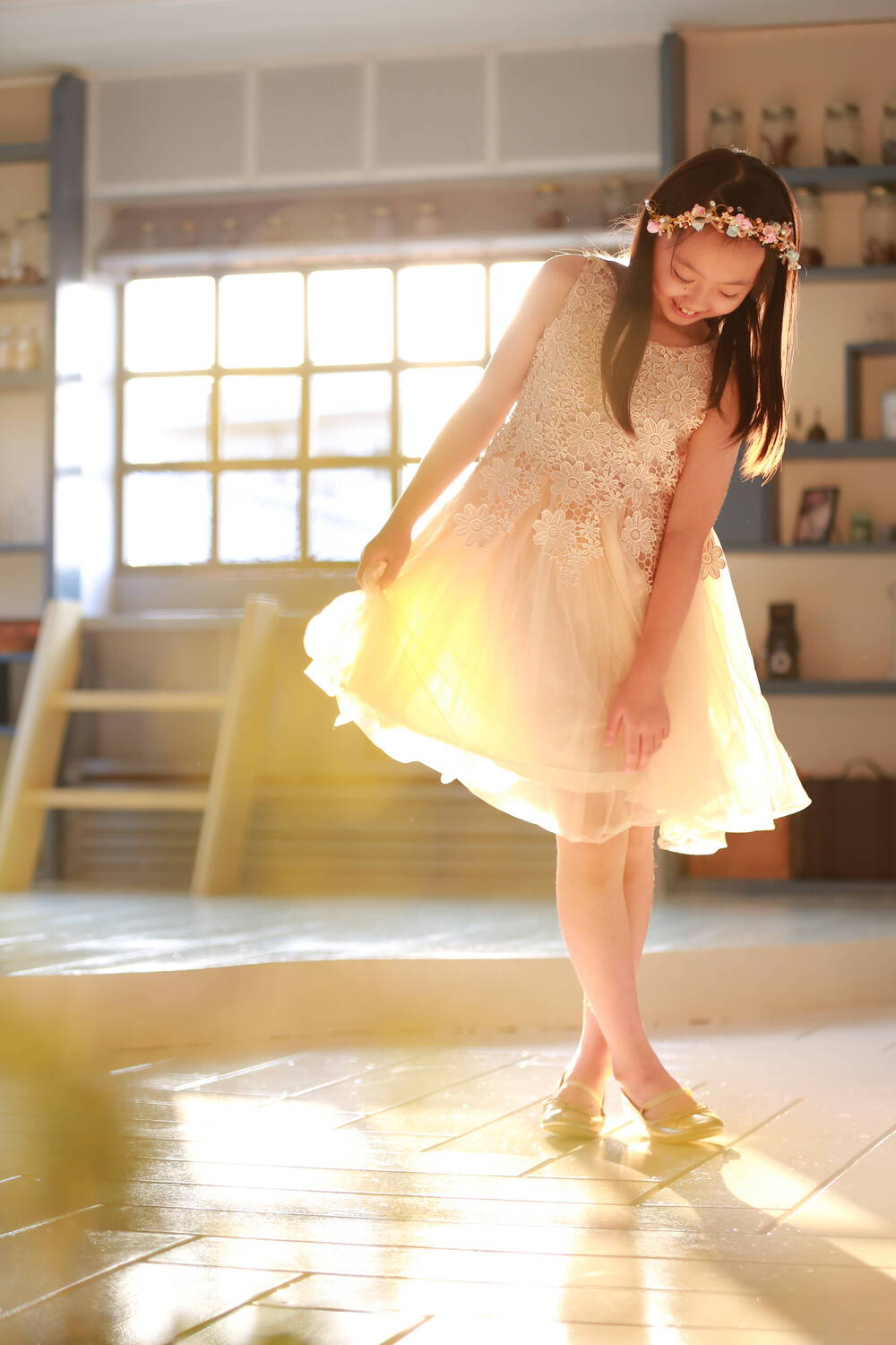 部屋の中に伸びた光は逆光となって彼女に纏わり付き、その存在感を際立たせました。ゴールドのドレスと光の色味が相まって、彼女の為の光は写真の中で華やかに印象を作ります。