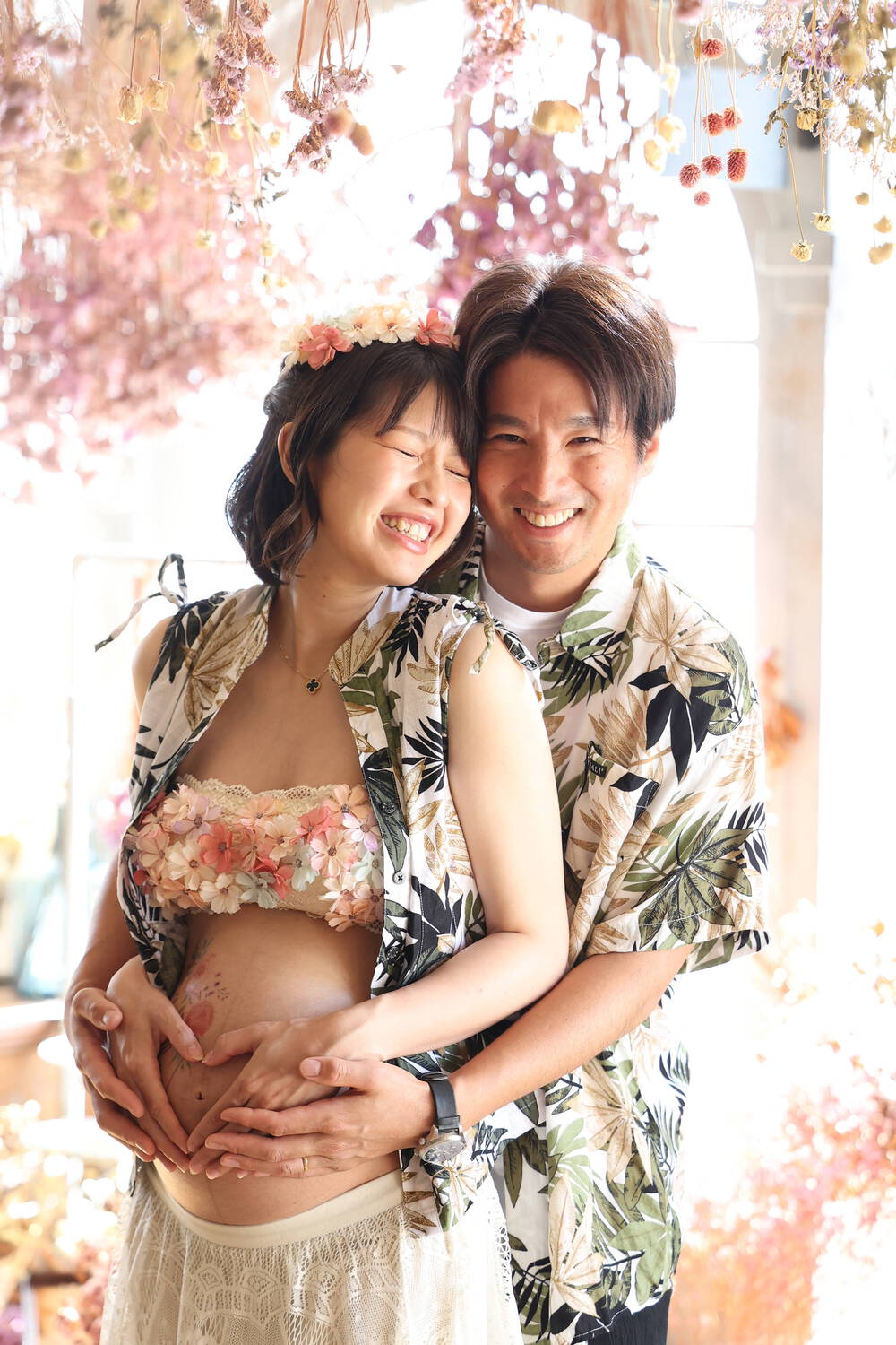 パパ・ママ・お腹の赤ちゃんに目がいくように、背景のドライフラワーは思いっきりぼかして撮影。
